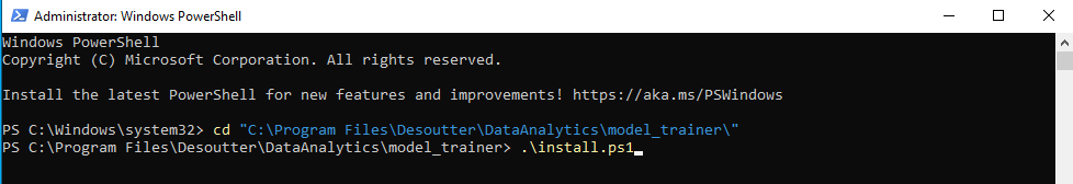 - Open a Power Shell command tool with Administrator privileges. Run the install script in the model_trainer folder.