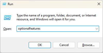 - Type optionalfeatures and press Enter.