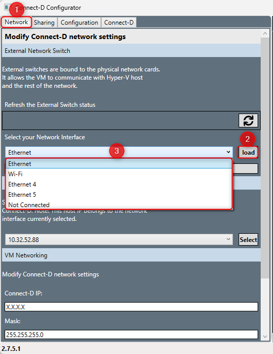 - Click Load in the Exernal Network Switch section. Once all the Network interfaces available on your computer are detected, expand the drop down list then select the Ethernet link you wish to dedicate to the CONNECT-D.