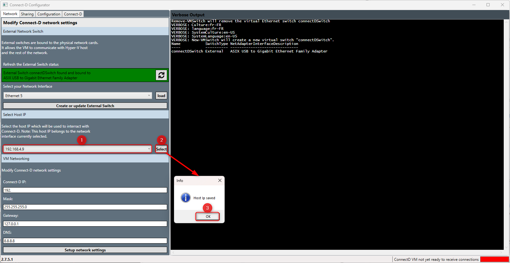 - Provide your CONNECT-D IP: this IP address is used to interface your device with your Network - note that this address must be different from the Host IP previously selected.