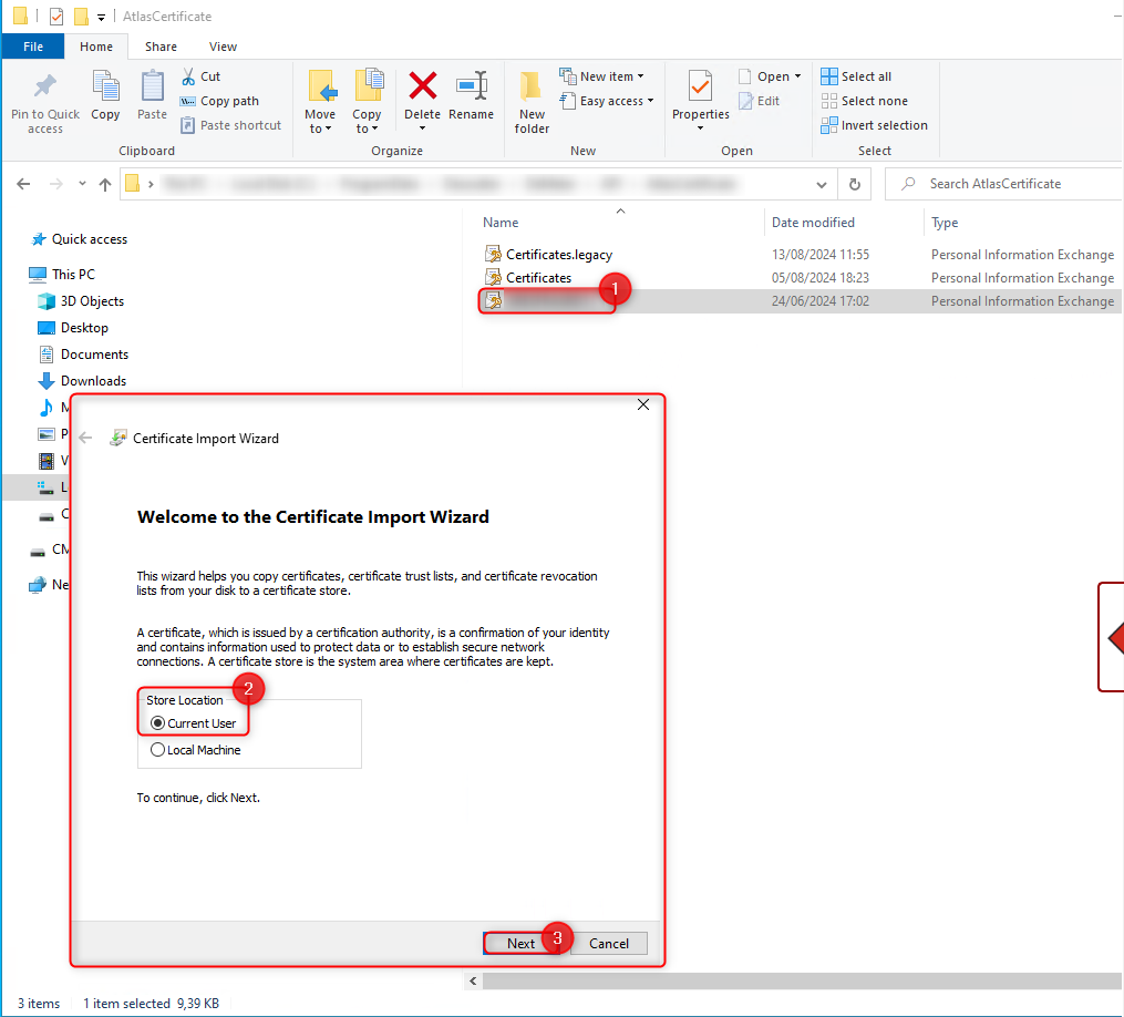 - Double click on the certificate: the Certificate Import Wizard opens.