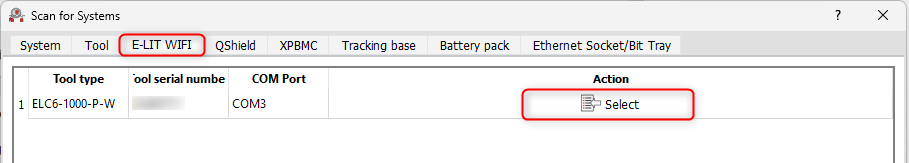 - Select the eLit WIFI panel then click the Select button associated to your tool.